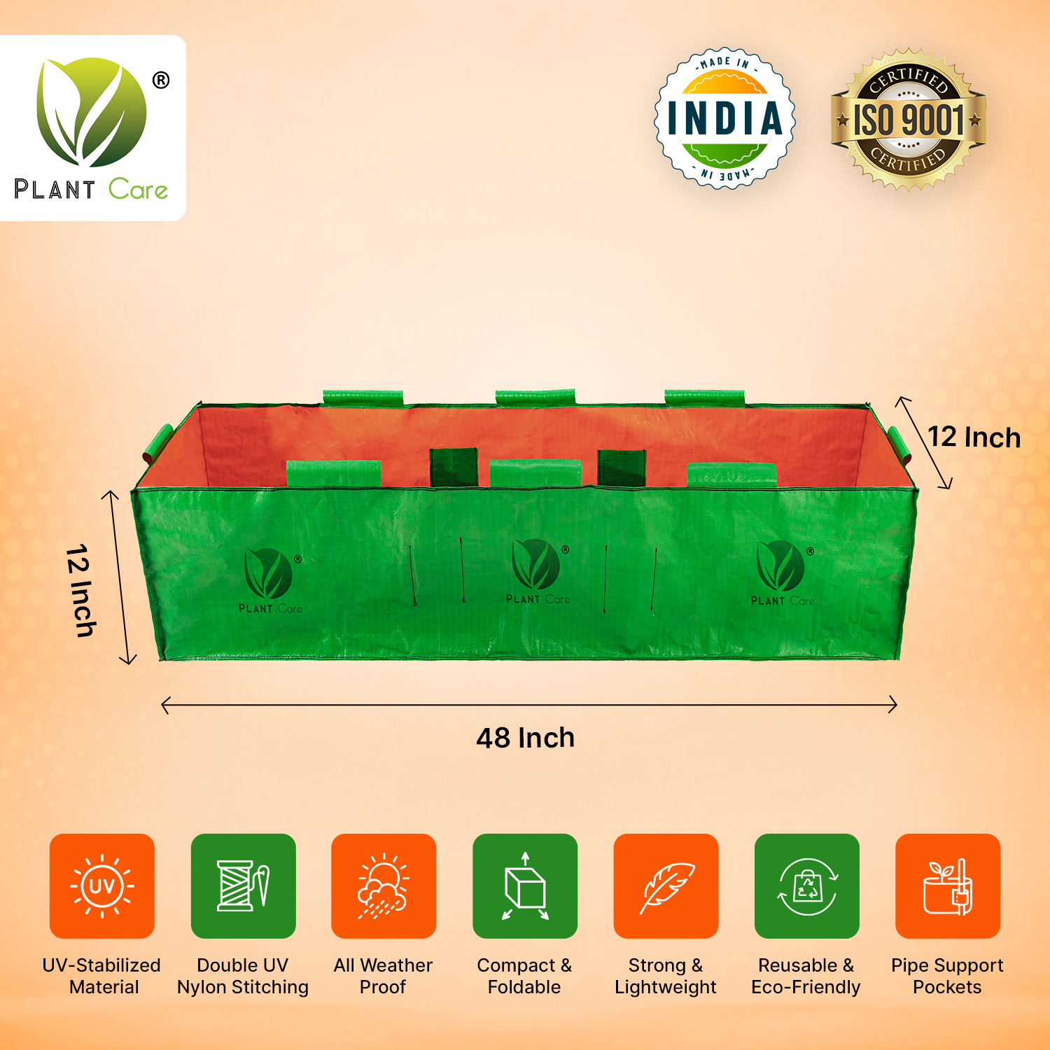 The 48x12x12ย Rectangle Grow Bag is a durable, UV-stabilized planting solution made from high-density polyethylene (HDPE). Designed for greenhouse and terrace gardening, these grow bags ensure long-lasting performance with a life expectancy of up to 7 years in a controlled greenhouse environment and 4-5 years under direct sunlight, depending on usage. This export-quality grow bag is perfect for growing a variety of plants, including vegetables, flowers, and herbs, while providing superior root support and water retention.