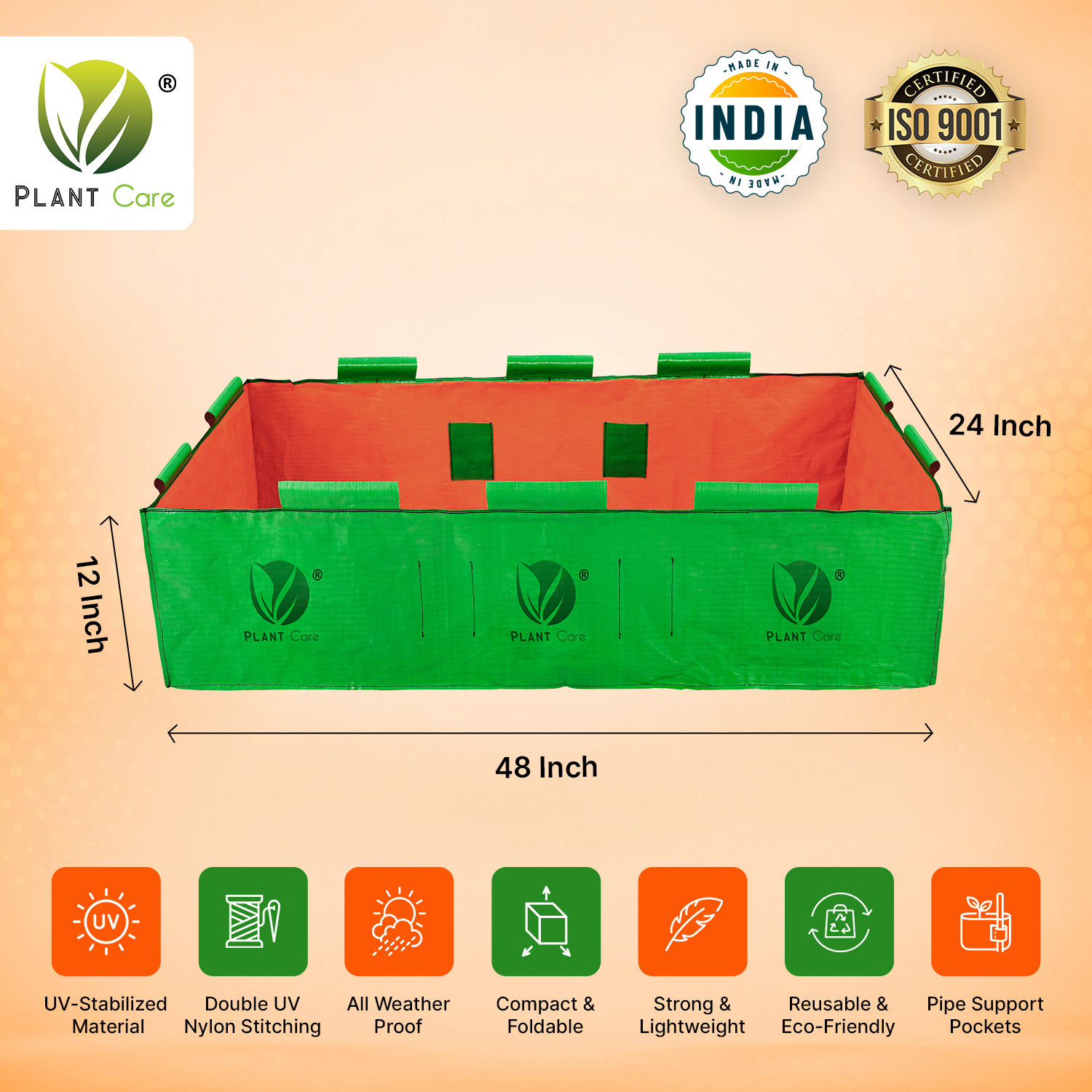 The 48x24x12 Rectangle Grow Bag is a durable, UV-stabilized planting solution made from high-density polyethylene (HDPE). Designed for greenhouse and terrace gardening, these grow bags ensure long-lasting performance with a life expectancy of up to 7 years in a controlled greenhouse environment and 4-5 years under direct sunlight, depending on usage. This export-quality grow bag is perfect for growing a variety of plants, including vegetables, flowers, and herbs, while providing superior root support and water retention.